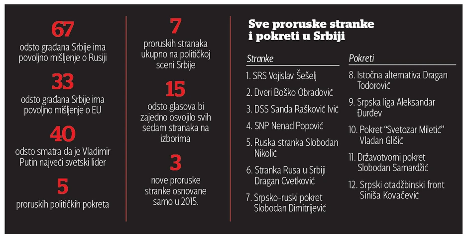 Srbija ima ukupno 107 registrovanih partija, od kojih je sedam proruskih, ali sve one zajedno ne bi osvojile više od 10 odsto glasova. Deluje još i pet političkih pokreta, koji još uvek nisu uspeli da skupe dovoljno potpisa da bi se registrovali kao stranke.
