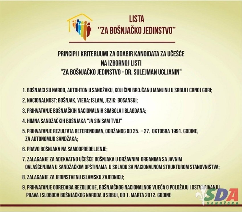 Na zvaničnom sajtu te stranke, čiji je lider Sulejman Ugljanin, objavljeni su principi i kriterijumi za izbor kandidata za učešće na izbornoj listi "Za bošnjačko jedinstvo - dr Sulejman Ugljanin".