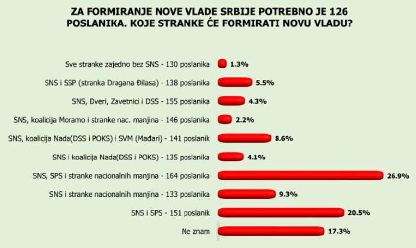 Prema istom istraživanju, 20,5 odsto smatra da će vladu činiti koalicija samo naprednjaka i socijalista, dok 9,3 procenta smatra da će to biti koalicija SNS i manjinskih stranaka. Njih 8,6 se izjasnilo da misli da će u izvršnu vlast ući SNS i koalicija NADA, a 5,5 odsto da će vlast praviti SNS i SSP Dragana Đilasa. Za sve druge kombinacije izjasnilo se značajno manje ispitanika.