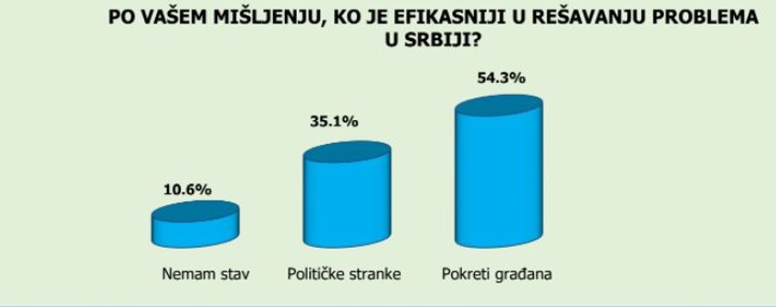 Na pitanje ko je efikasniji u rešavanju problema građana, stranke ili pokreti, 54,3 odsto je reklo da su to pokreti, 35,1 stranke, a stav nema 10,6 odsto.