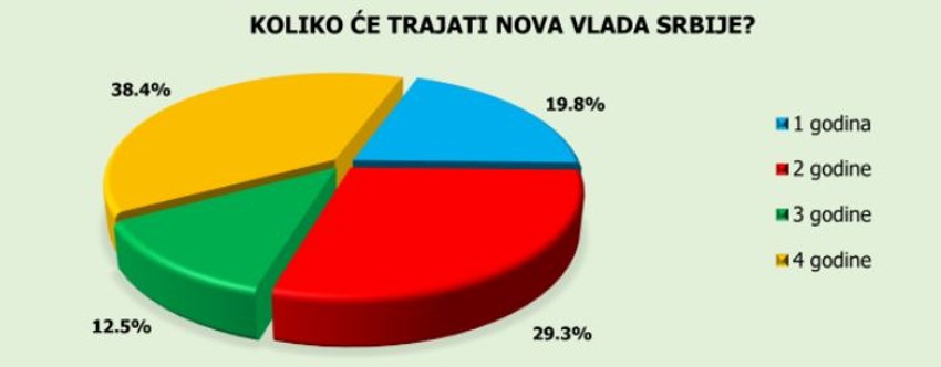 Građani su optimistični kada je u pitanju mandat nove vlade, pa njih 38,4 odsto navodi da će Vlada izdržati ceo mandat od četiri godine. Njih 29,3 odsto veruje da će vlada trajati dve godine, 19,8 procenata je reklo godinu dana, dok se 12,5 odsto izjasnilo za tri godine.