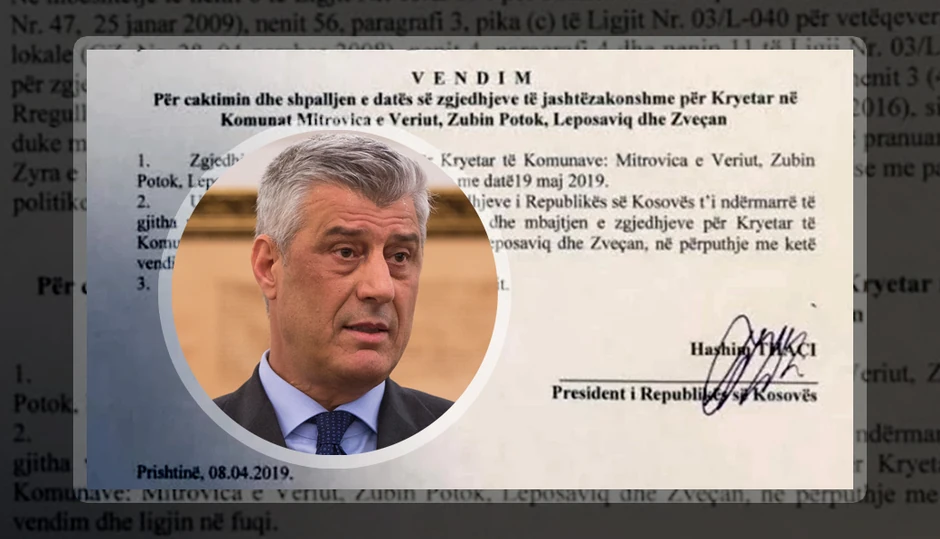 U saopštenju iz Tačijevog kabineta se navodi da u skladu sa "ustavnim, zakonskim ovlašćenjima, imajući u vidu pismo ministarstva za administraciju lokalne samouprave i nakon konsultacija sa političkim strankama i Centralnom izbornom komisijom", odlučeno je da vanredni lokalni izbori u pomenute četiri opštine budu održani 19. maja.