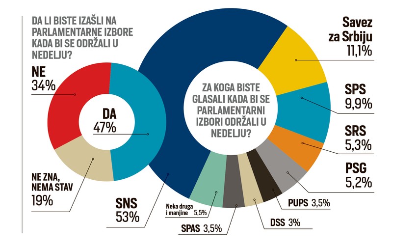 Kada bi se izbori održavali sledeće nedelje, Srpska napredna stranka osvojila bi natpolovičnu većinu, a cenzus bi prešli još i SzS, socijalisti, radikali i Pokret slobodnih građana.