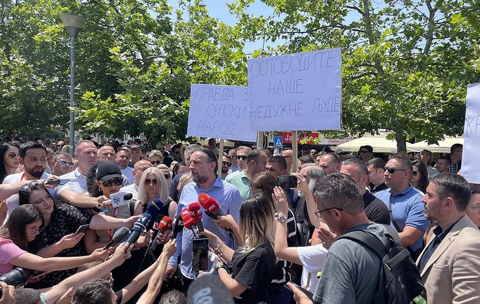 "Osnovno pitanje koje smo juče postavljali sebi i drugima je: Ko je sledeći? Kako živeti u društvu u kom se pitate ko je sledeći za hapšenje? Mi imamo potrebu da živimo u slobodi, proterali su nas iz gradova u Prizrenu živi četvoro Srba u Prištini ih je manje od 15, sabijeni smo u geta u koja se danas dolazi kao u kaznene ekspedicije da se hapse ljudi", rekao je pred okupljenima na protestu Živojin Rakočević, književnik i novinar.
