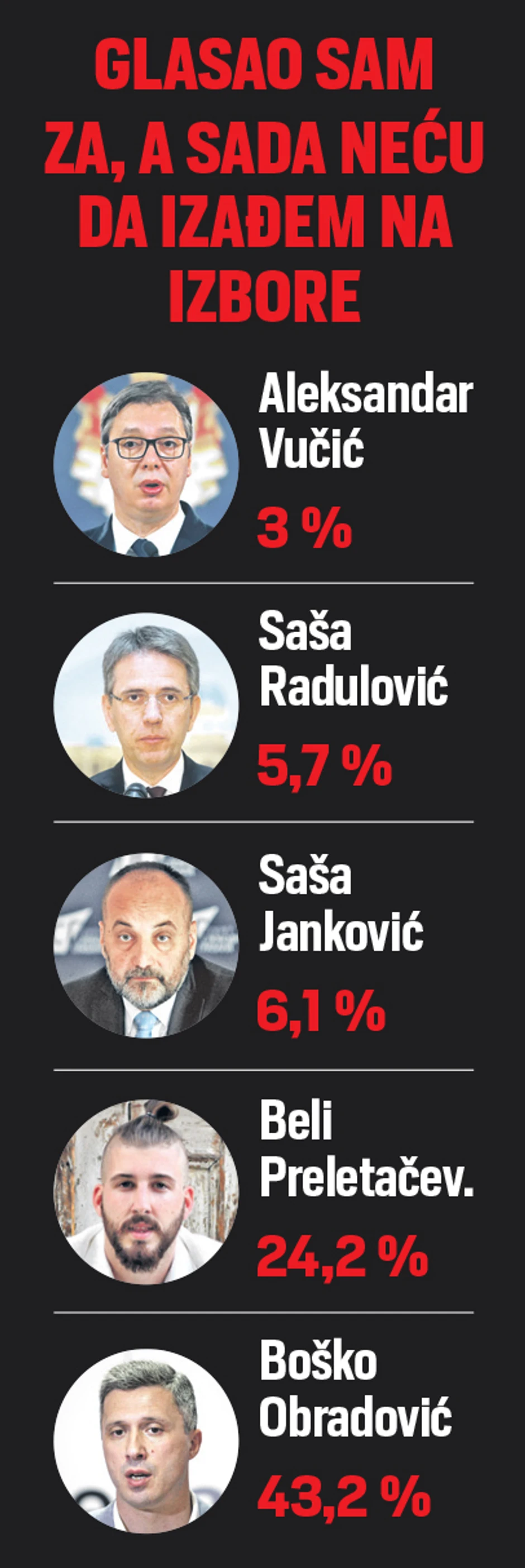 Konačno, istraživanje pokazuje i čiji su se glasači najviše preselili među apstinente. U odnosu na one koji su na predsedničkim izborima 2017. glasali za Sašu Jankovića, apstinenata je 6,1 odsto, među glasačima Belog Preletačevića (Luke Maksimovića) ih je 24,2 odsto, a procentualno najviše ih je među onima koji su 2017. glasali za Boška Obradovića - čak 43,2 odsto. Svega tri odsto onih koji su 2017. glasali za aktuelnog predsednika Aleksandra Vučića sada ne bi izašlo na izbore.