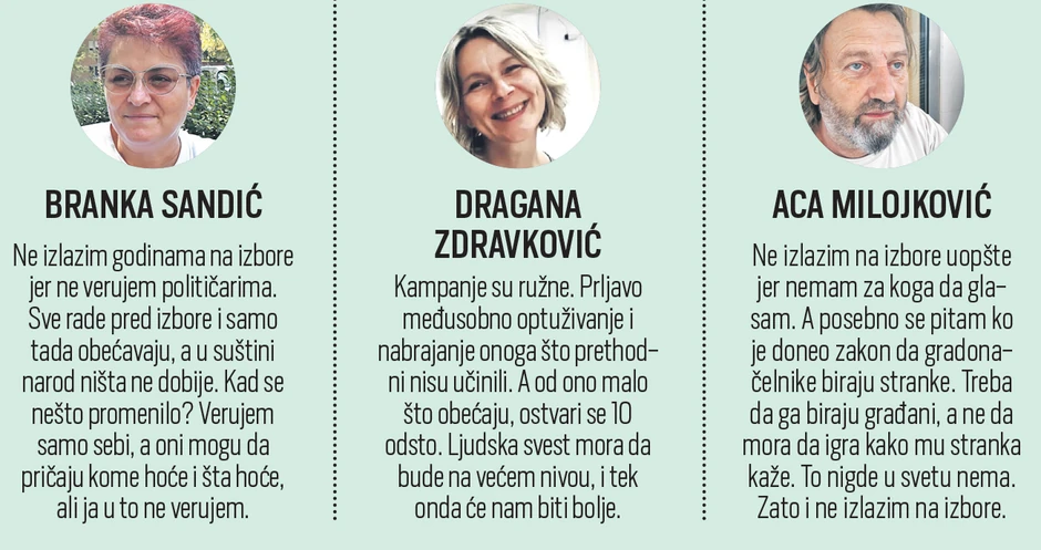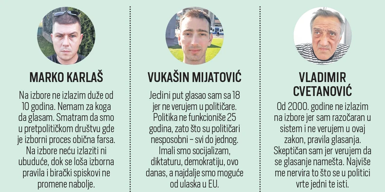 - S jedne strane, to su pripadnici marginalizovanih delova društva koji su društveno i politički isključeni, a to znači da su malo ili nimalo spremni da artikulišu svoje interese kroz izazak na izbore. Drugu grupu apolitičnih čine oni koji dolaze iz viših slojeva i koji na politiku gledaju kao na zabavu za narod, jer svoje interese zadovoljavaju i štite van politike, odnosno politika kao takva na njihov život ne utiče - kaže Gavrilović.