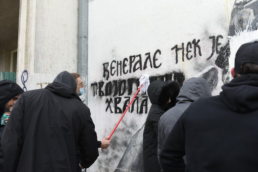 Nakon što je mural posvećen haškom osuđeniku Ratku Mladiću danas uništen tako što je na njega bačena bela farba, ne smiruju se strasti na uglu Njegoševe i ulice Alekse Nenadovića na beogradskoj opštini Vračar. Epilog je, posle više sati ribanja svim i svačim, gotovo očišćen Mladićev lik.