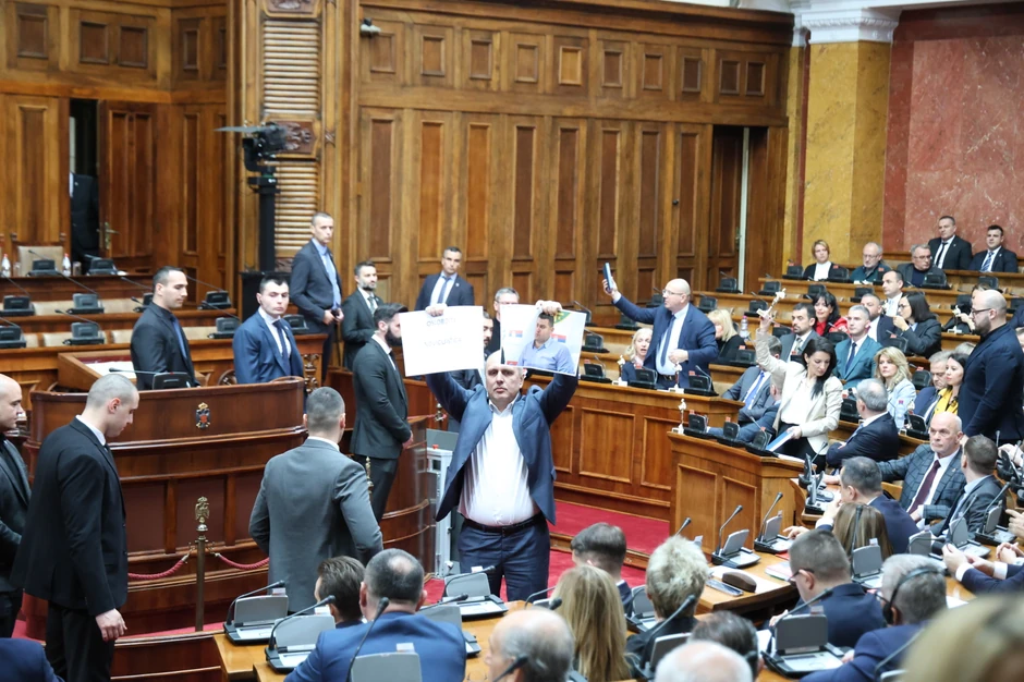 Prvi dan sednice obeležila je polemika vlasti i opozicije - negodovanja, transparenti i koškanje sa obezbeđenjem. Bilo je i momenata kada su poslanici opozicije tražili da dobiju reč i ukažu na povredu Poslovnika, zbog čega su neki od njih ustali sa svojih mesta i došli gotovo do predsedavajućeg u tom trenutku, Stojana Radenovića. Usledilo je koškanje, a reagovalo je obezbeđenje koje je stalo između stola predsedavajućeg i ostatka sale i narednih dana tu i ostalo.