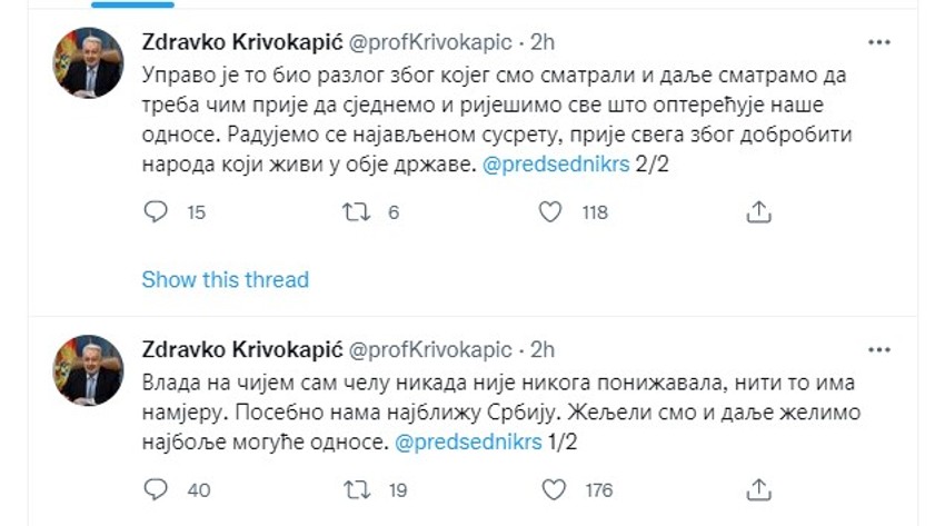 "Radujemo se najavljenom susretu, pre svega zbog dobrobiti naroda koji živi u obe države", naglasio je Krivokapić i "tagovao" u svojim porukama nalog predsednika Srbije "predsednikrs".