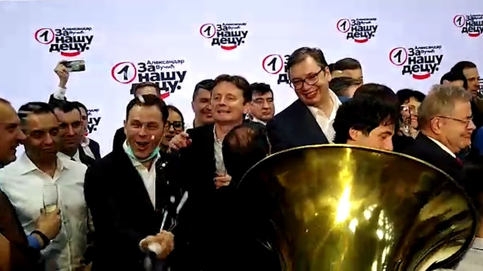 Nakon što je predsednik Aleksandar Vučić proglasio pobedu svoje stranke, trubači su ponovo zasvirali i slavlje je nastavljeno uz šampanjac!