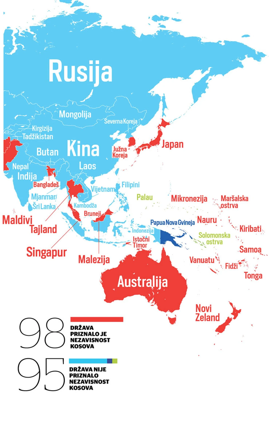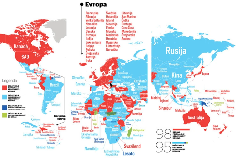 Godinu dana kasnije, nakon brojnih diplomatskih poteza obe strane, neulaženja Kosova u Interpol, stavljanja na snagu taksi od strane Prištine na srpsku robu, ali i stalne borbe moći između istoka i zapada na ovom prostoru, skor se promenio: 98 zemalja i dalje priznaje Kosovo, dok je 95 država protiv nezavisnosti, sudeći po podacima koji su dostupni javnosti.