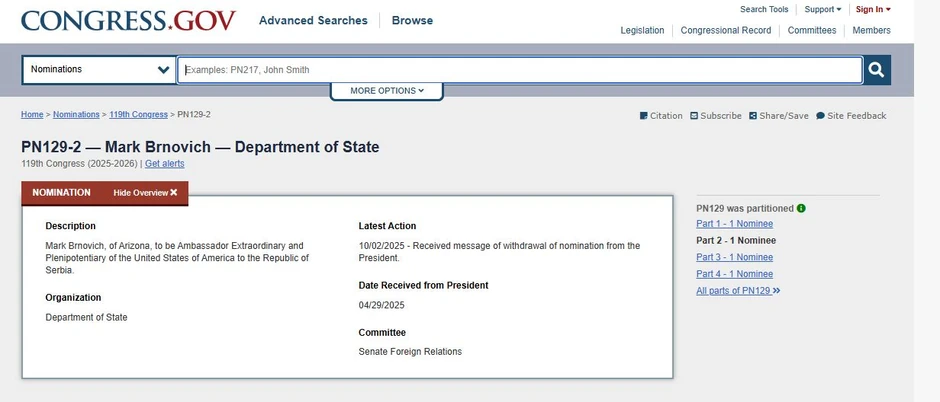 Administracija američkog predsednika Donalda Trampa povukla je nominaciju Marka Brnovića za ambasadora u Srbiji, navodi se u odluci objavljenoj na sajtu Odbora Senata SAD za spoljne poslove.