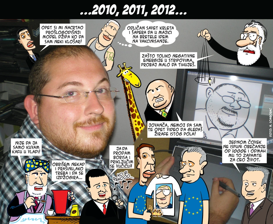 Kombinacija maltene celodnevnog praćenja vesti i inspiracije, dok se sat koji označava cajtnot za slanje sve više bliži i bliži. S godinama naravno to ide uigranije, ali tempo i smene aktuelnosti su takve da te porođajne “muke” stvaranja dnevnog stripa uvek čekaju poslednji čas. Najbolje to, uz mene, znaju i naši urednici i prelamači kojimo sam večno zahvalan što me čekaju sve ove godine.