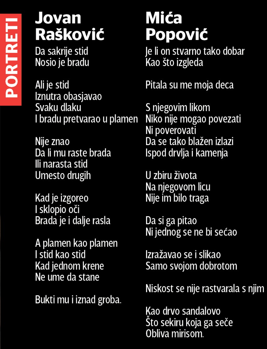 - Prvi i poslednji moj portret je Vera Pavladoljska. Ona je kao ruska Matrjoška u koju sve staje. Kad smo na venčanju razmenili burme, rekla je: Mislila sam da nećeš doći. A kad sam objavio poemu Vera Pavladoljska i upotrebio njeno kršteno ime, pitala me je: Na koga si mislio? Nisam spomenuo i tri portreta Vaska Pope. Jednom sam u Hilandaru tražio monaha Arsenija, koji mi je ostao u sećanju kad sam tamo boravio prvi put 1976. godine. Bio je to jedan visok, tek pristigao monah, u suroj suknenoj rizi. Pitam gde je Arsenije, kažu mi da je uzeo zavet ćutanja, da ne govori i nikog ne prima. Ali vas će primiti, rekoše. Odvedu me do njegove ćelije, Arsenije sedi za stolom. Pred njim gomila knjiga. Zagrlimo se, bez reči. Ćutimo, a on u jednom trenutku progovori: “Je li umro Vasko Popa?”. Ja potvrdim klimanjem glave. Kaže on: “Čuo sam nešto!”. Izađem napolje i viknem: “Raduj se Vasko Popa!”. I to je postala moja pesma.