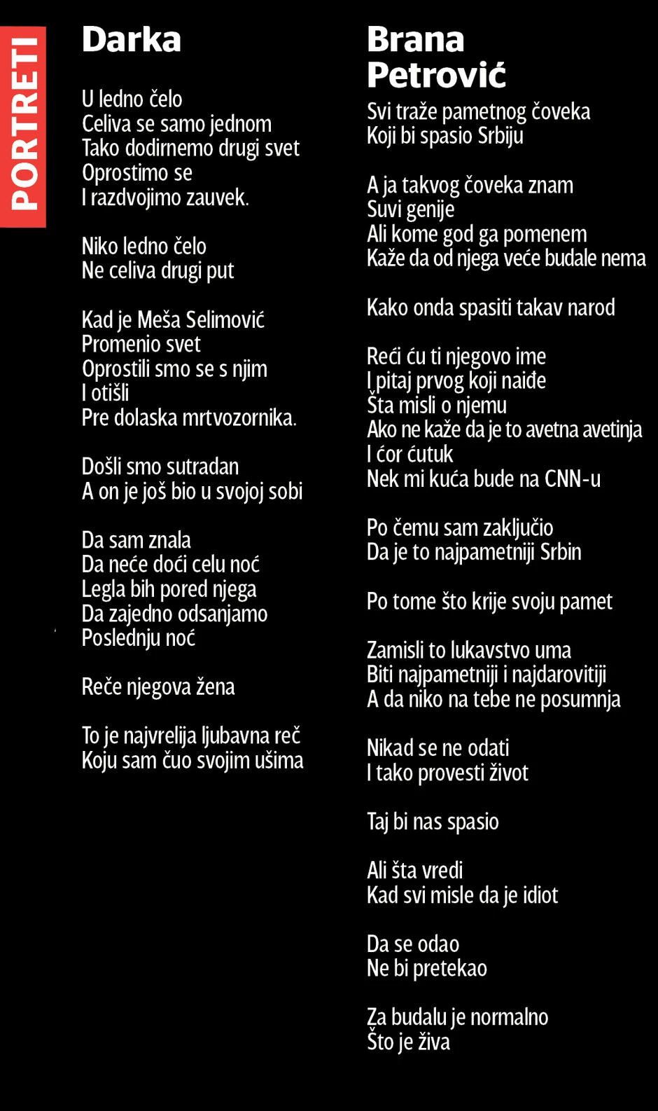 - Sada je na sceni digitalna pismenost, fejsbuk javnost, internet zajednica, kultura ekrana. Mnogi ljudi su hrabri na internetu. U četiri oka ih više nema. Ima mnogo virtuelnih prijateljstava ljudi koji se nikad nisu sreli. Moji prijatelji su bili deo mog realnog života. Teško ih je nabrojati. U decenijama iza nas napustili su nas mnogi veliki ljudi. Pokušavao sam, ali dok se ta imena odštampaju, pridruži im se još nekolicina. Posle me pitaju što si preskočio ovog ili onog. Bilo je i onih s kojima sam proveo sate, ali se još nije izdvojio nijedan detalj koji bi postao pesma. U mojim portretima nema laži i izmišljotina. To nisu apstraktni portreti. Bio bi greh izmišljati. Ne znam da li su oni zapamtili iste događaje. Da li dva čoveka ikad zapamte istu stvar sa istog mesta. Što su bolji, sve više liče na izmaštane i nemoguće.