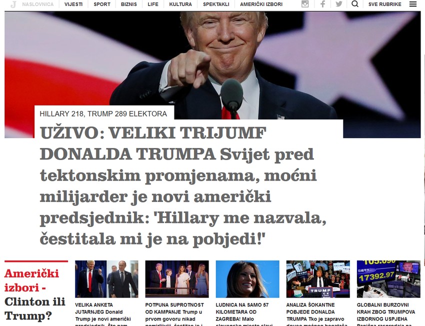 HRT navodi da je Tramp pobedio na predsedničkim izborima u SAD, te da je njegovo obraćanje bilo "nenadnuto". "Hvala vam, bilo je komplikovano", preneo je HRT Trampove reči.
