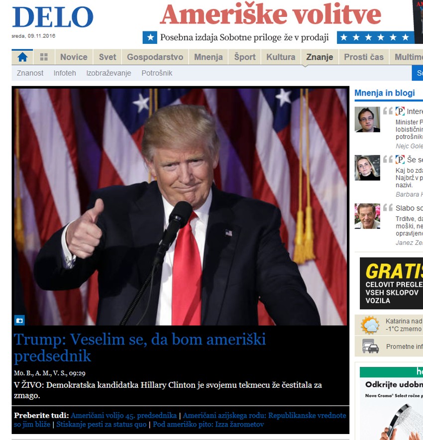 Najuticajni slovenački dnevnik "Delo", pored tesktova o pobedi Trampa piše i da je Meleni postala prva američka dama koja nije rođena u Americi. Dnevnik donosi priču o manekenki koja će se sada preseliti u Belu kuću.