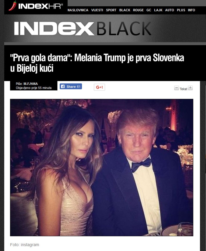 Pa tako Večernji list donosi tekst o putu mlade Slovenke do Bele kuće i kako se Melanija preobrazila u glamuroznog leptira. "Indeks" piše o "Prvoj goloj dami" i prvoj Slovenki u Beloj kući.
