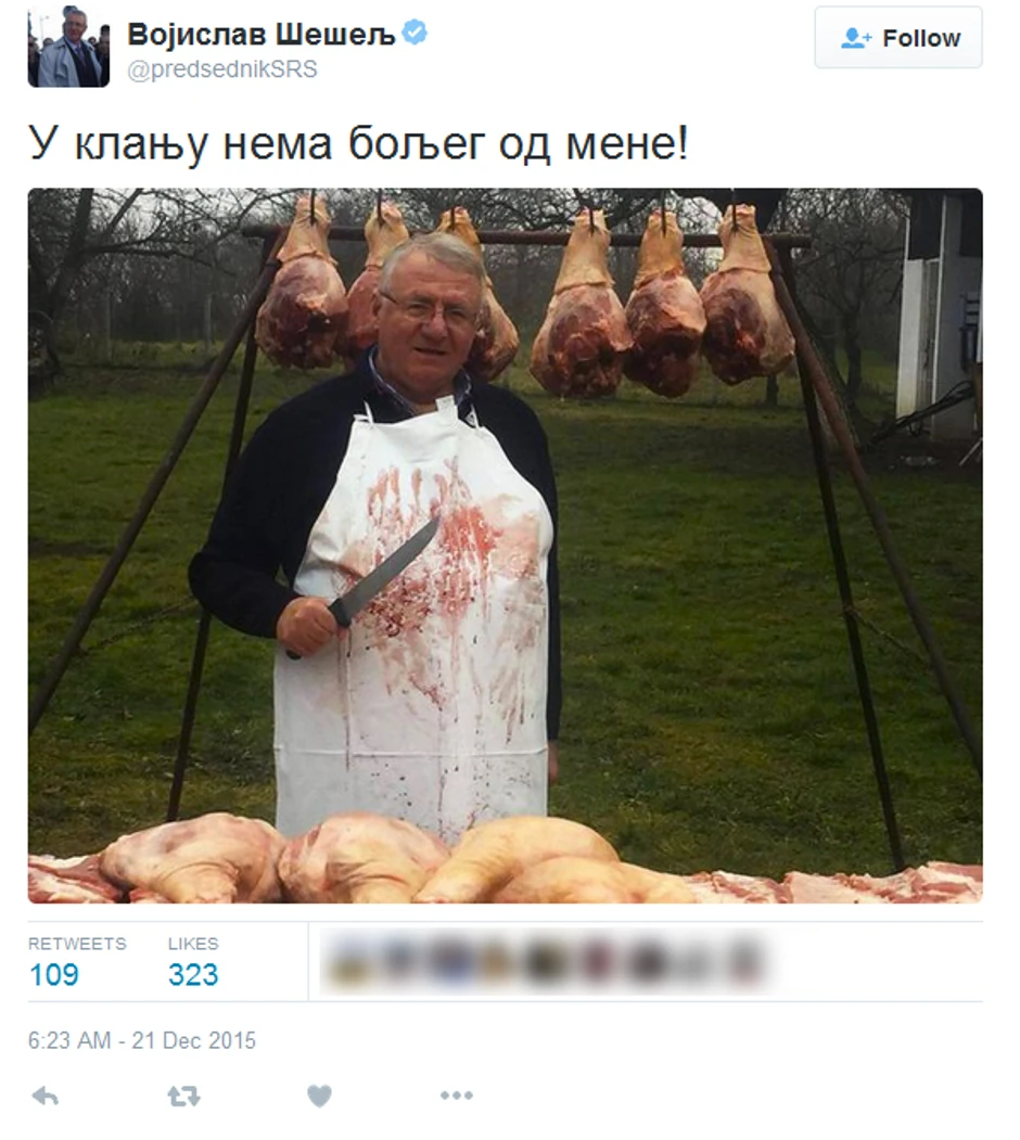 Pored druge fotografije piše "Evo, opet koljem", dok je u opisu treće Šešelj napisao "U klanju nema boljeg od mene".