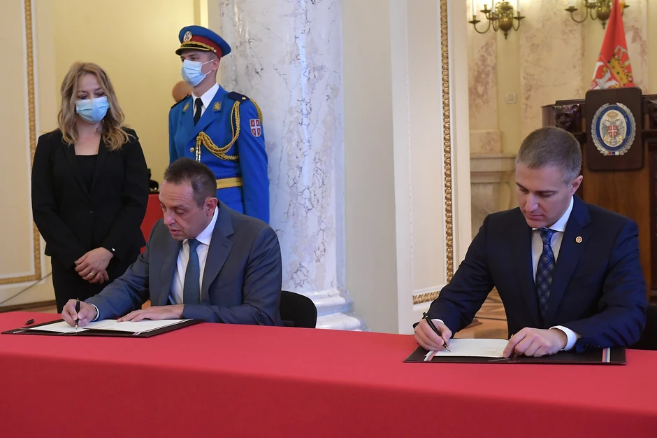Nakon intoniranja državne himne ministri Stefanović i Vulin potpisali su Zapisnik o primopredaji dužnosti.