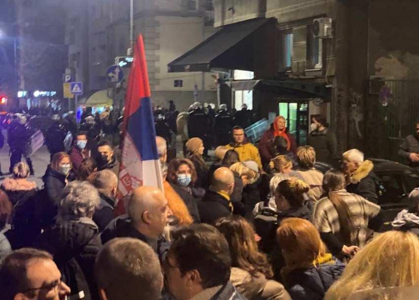 Okupljeni aktivisti, pripadnici nevladinih organizacija i pojedini opozicioni političari organizovali su protestnu šetnju od Doma sindikata u znak podrške aktivistkinji Aidi Ćorović, koja je privedena jer je mural juče popodne gađala jajima. Oni su nosili transparent "Mural mora pasti".