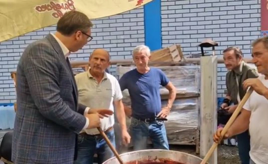Vučić se po dolasku u Osečinu prihvatio i kutlače, pa je malo promešao i džem koji se kuvao.