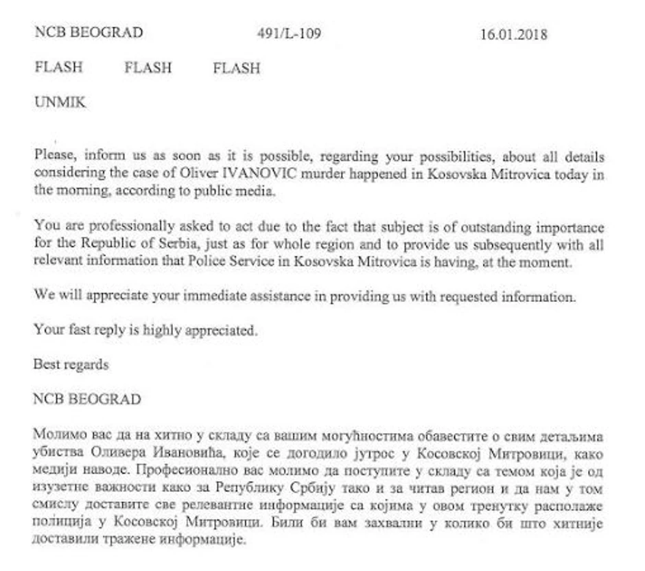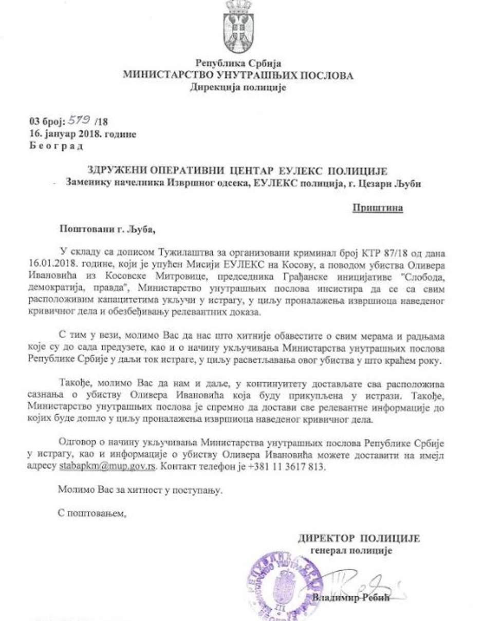 Ministarstvo unutrašnjih poslova saopštilo je danas da je više puta kontaktiralo predstavnike Euleksa i UNMIK-a i to odmah nakon što je upućen zvaničan dokument Tužilaštva za organizovani kriminal kojim se zahtevalo učešće naših istražnih organa u sprovođenju istrage ubistva Olivera Ivanovića.