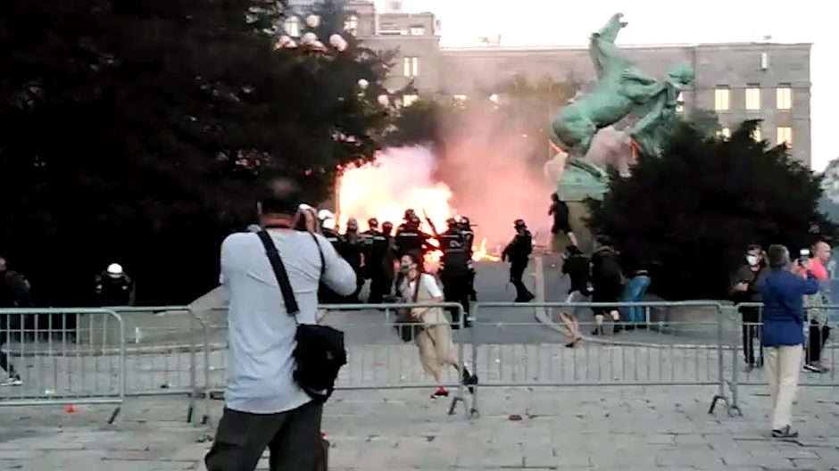 Na prostoru ispred Doma Narodne skupštine, nešto nakon 20.15 časova, ispaljen je veći broj suzavaca i topovskih udara, a dim se i dalje širi Trgom Nikole Pašića i okolinom.