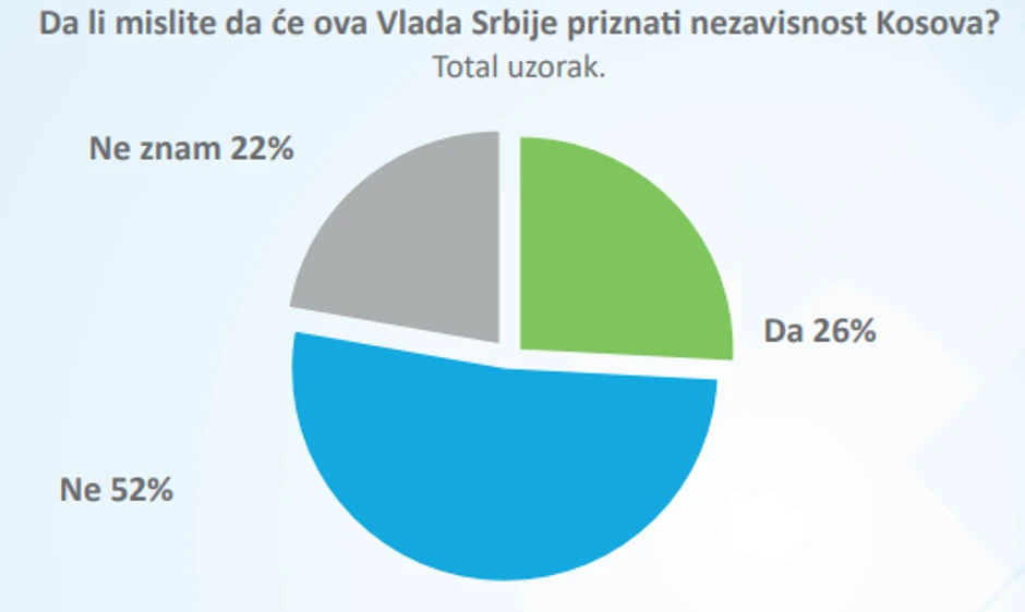 Nešto više od četvrtine, 26 odsto njih, smatra da će ova Vlada priznati Kosovo, nešto više od polovine, 52 procenata, da ova Vlada to neće učiniti, dok 22 odsto ne zna da se izjasni po ovom pitanju.