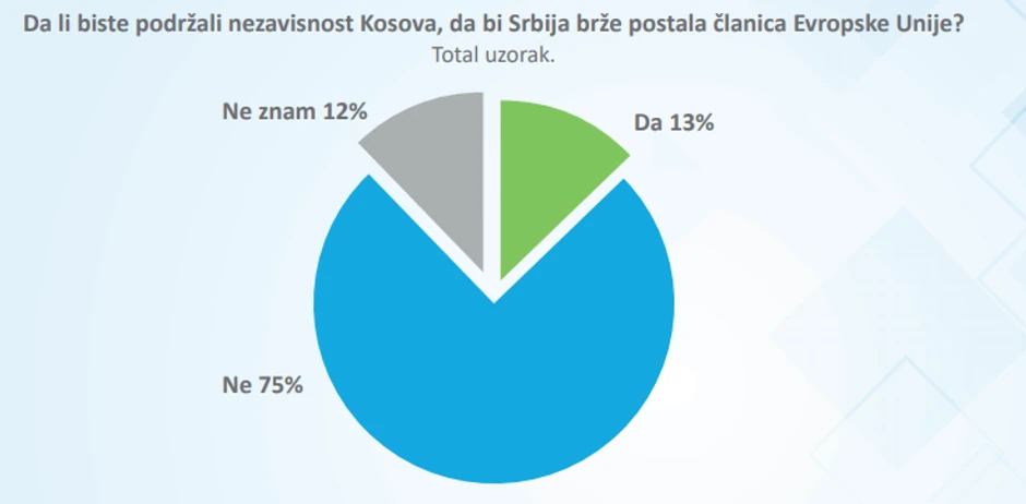 Veliki broj građana, 75 odsto njih, ne bi podržalo nezavisnost Kosova zarad bržeg ulaska Srbije u Evropsku uniju. Za taj korak bi se odlučilo 13 odsto njih, a 12 odsto je neodlučnih.