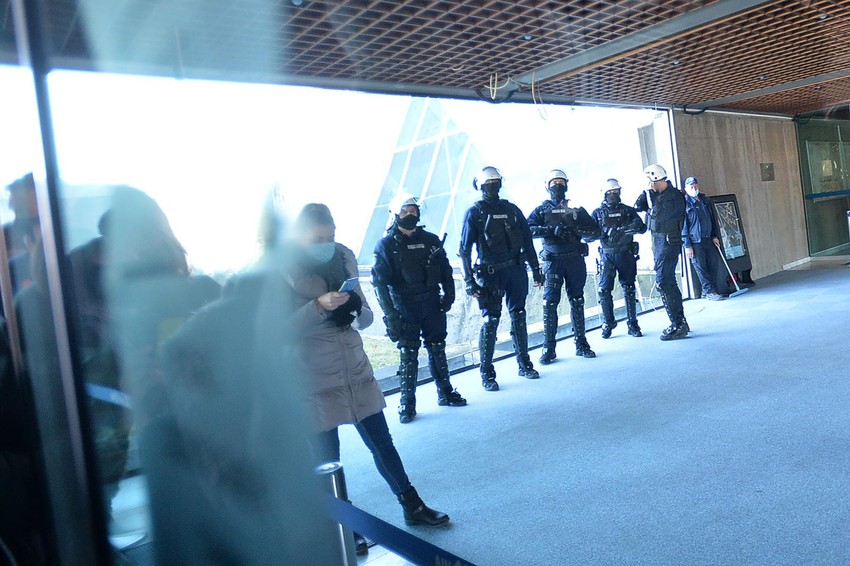Na ulazu u Sava centar su pripadnici Komunalne milicije, koji ih sprečavaju da uđu, a u holu su i pripadnici policijske brigade, koji za sada nisu intervenisali.