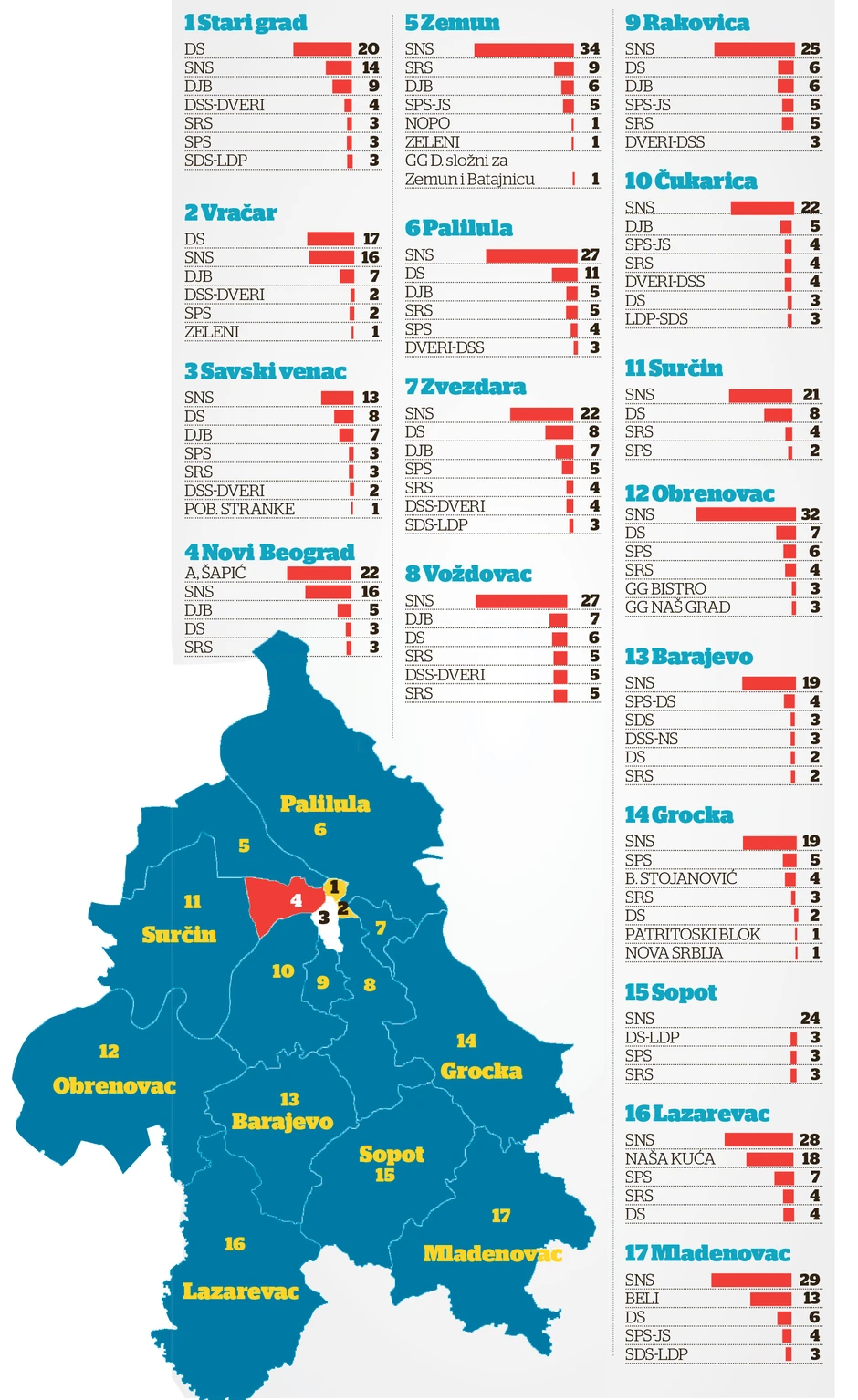 Naprednjaci su manje-više ponovili uspeh sa prošlih republičkih izbora iz 2014. godine kada su bili najuspešniji u 15 lokalnih samouprava. Međutim, iako su “počistili” konkurenciju na Paliluli, Zvezdari, Voždovcu, Čukarici, Rakovici, u Sopotu, Grockoj, Barajevu, Mladenovcu, Surčinu, Obrenovcu, Zemunu i Lazarevcu, čini se da nisu postigli svoj glavni, psihološki cilj - “rušenje” Vračara.