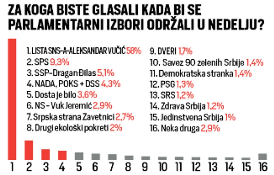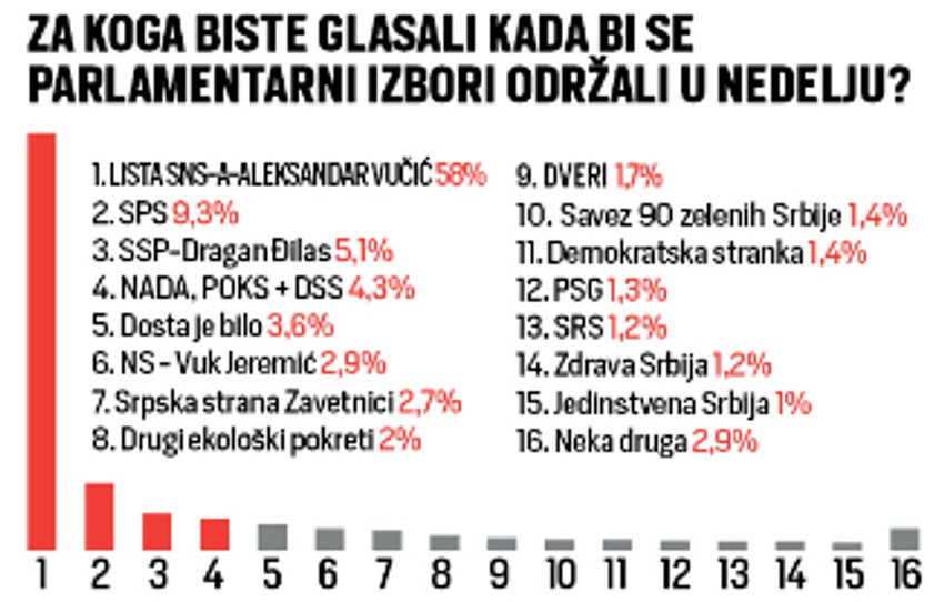 Rejting naprednjaka nepromenjen je već godinama, baš kao i procenat onih koji bi glas dali socijalistima i kreće će između devet i deset procenata. S druge strane, rejting SSP Dragana Đila u blagom je porastu, ali dovoljnom da dobaci prag od pet procenata. A, cenzus od tri odsto, prešli bi još Dosta je bilo i koalicija NADA koju čine Demokratska stranka Srbije i Pokret obnove kraljevine Srbije, dok je na samoj granici Narodna stranka Vuka Jeremića sa 2,9 odsto podrške u biračkom telu.