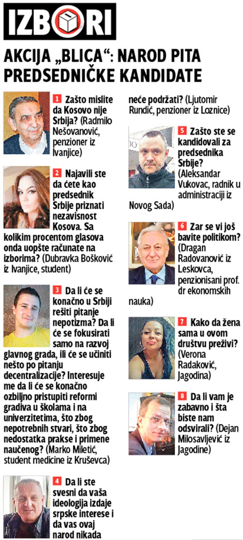 1. Jedinu moguću u okolnostima kada su jedni mediji provučićevski, a drugi prozapadni. Za nekoga ko je za promenu politike, dakle i za promenu vlasti i za prekid evrointegracija, nema novca da se plate gostovanja, a mediji su najvećim delom zatvoreni.