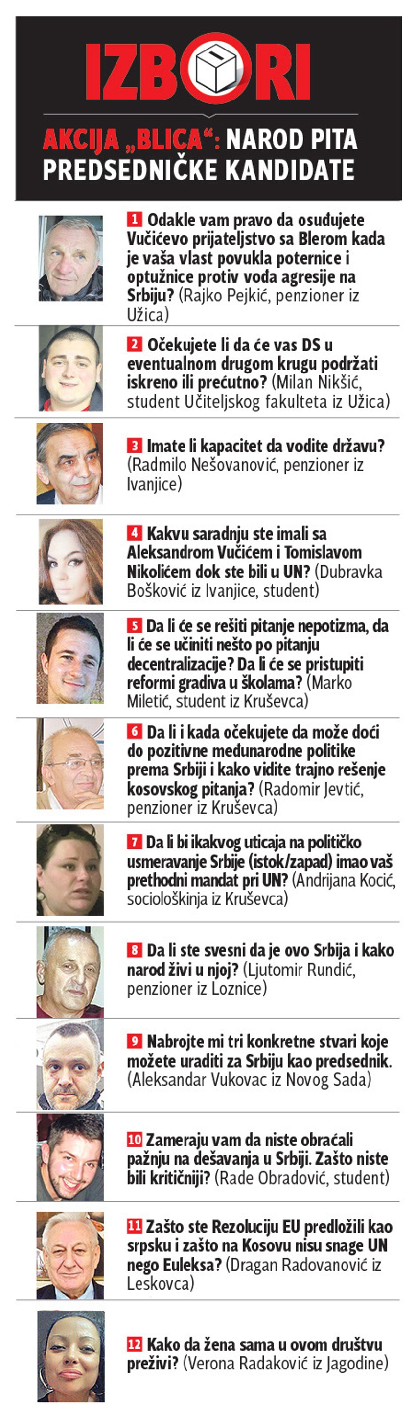 8. Od 2003. živim u Srbiji, sa izuzetkom jednogodišnjeg perioda kada sam bio na čelu GS UN-a. Više sam nego svestan kako se živi u Srbiji i upravo zato sam odlučio da se kandidujem. Nema velike koristi od dobre spoljne politike, ako je unutrašnja rđava. Predsednik može znatno uticati na kvalitet života. Biću predsednik koji aktivno učestvuje u sprovođenju mera za podizanje standarda i smanjenje nezaposlenosti, koje čine osnovu mog predsedničkog programa.