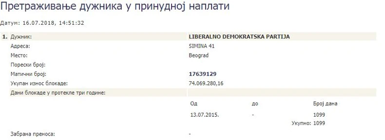 Kako su tada objavili mediji, stranka Čedomir Jovanovića bila je u blokadi 1,2 miliona dinara, a sada je toj partiji račun blokiran zbog duga od čak 74 miliona.