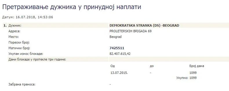 Najveći problem sa dugovanjima imale su demokrate. Njima je račun prvi put bio blokiran 2013. godine i to za čak 335,4 miliona dinara. Taj dug je u međuvremenu smanjen za četiri puta i sada iznosi 82,4 miliona dinara.
