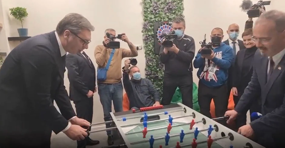 Predsednik Srbije Aleksandar Vučić i ambasador SAD Entoni Godfri, odigrali su danas u Data centru u Kragujevcu, partiju stonog fudbala.