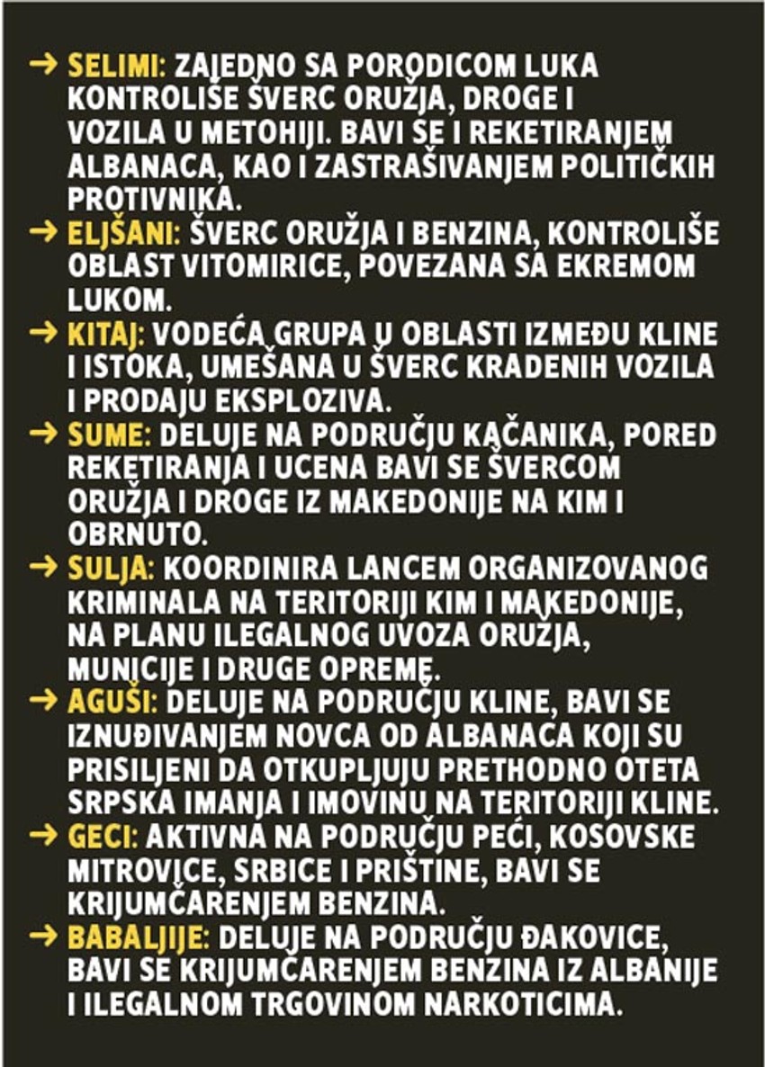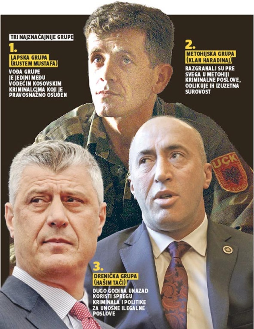 Mafija na KiM nije organizovana tako da ima jedan centar, već je podeljena na teritorije. Kao što smo već pisali, klan Hašima Tačija kontroliše oblast Drenice, porodica Ramuša Haradinaja Metohiju, a oblast Laba grupa Rustema Mustafe Remija. Sva trojica su vođe OVK, a Savet Evrope je u izveštaju konstatovao da je organizovani kriminal na KiM povezan sa bivšim pripadnicima OVK.