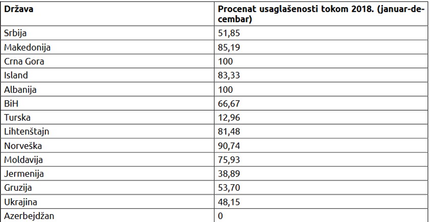 Dok joj je sa jedne strane strateško opredeljenje ulazak u Evropsku uniju Srbija, bar kada je reč o delima, to baš ne pokazuje izričito. Poslednji takav primer je njena usklađenost sa spoljnom i bezbednosnom politikom Unije, u čemu je među zemljama regiona na samom začelju.