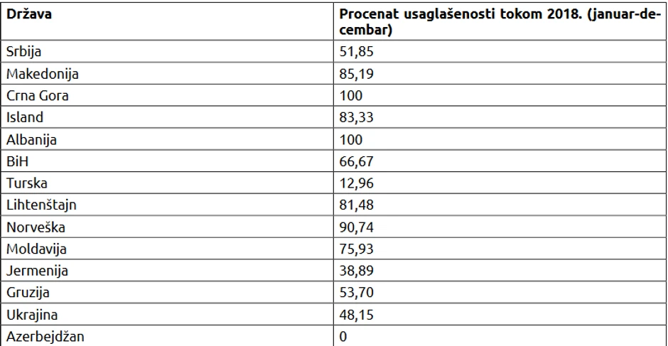 To pokazuje poslednje istraživanje ISAC fonda, prema kome je procenat usklađenosti 52 odsto. To isto pokazuju i izveštaji iz EU, koji svako malo napomenu da bi zvanični Beograd to trebalo da počne da čini, odnosno da intenzivira usklađivanje.