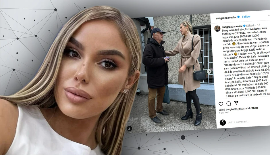 - Dragi narode, i vi volite kvalitetnu kafu i kvalitetnu čokoladu, normalno. Zbog toga sam juče obezbedila 2.000 kafa i 2.000 čokolada kao iznenađenje narodu. Ali moram da vam ispričam priču koja stoji iza ove akcije. Zovem ja mog sponzora kog je Kesić krstio u Mister X i kažem mu: "Ej, ja bih opet neku akciju”. Delila bih kafe i čokolade jer to realno vole svi. Kaže on meni: “Dobro, doneće ti ovi moji 1.000 evra”, gde sam počela vrištati od smeha i pitala ga da li je svestan da u Srbiji kafa od 200 grama košta 379,99 dinara i čokolada 169,99 dinara? - počela je ispovest Grozdanović na Instagramu.