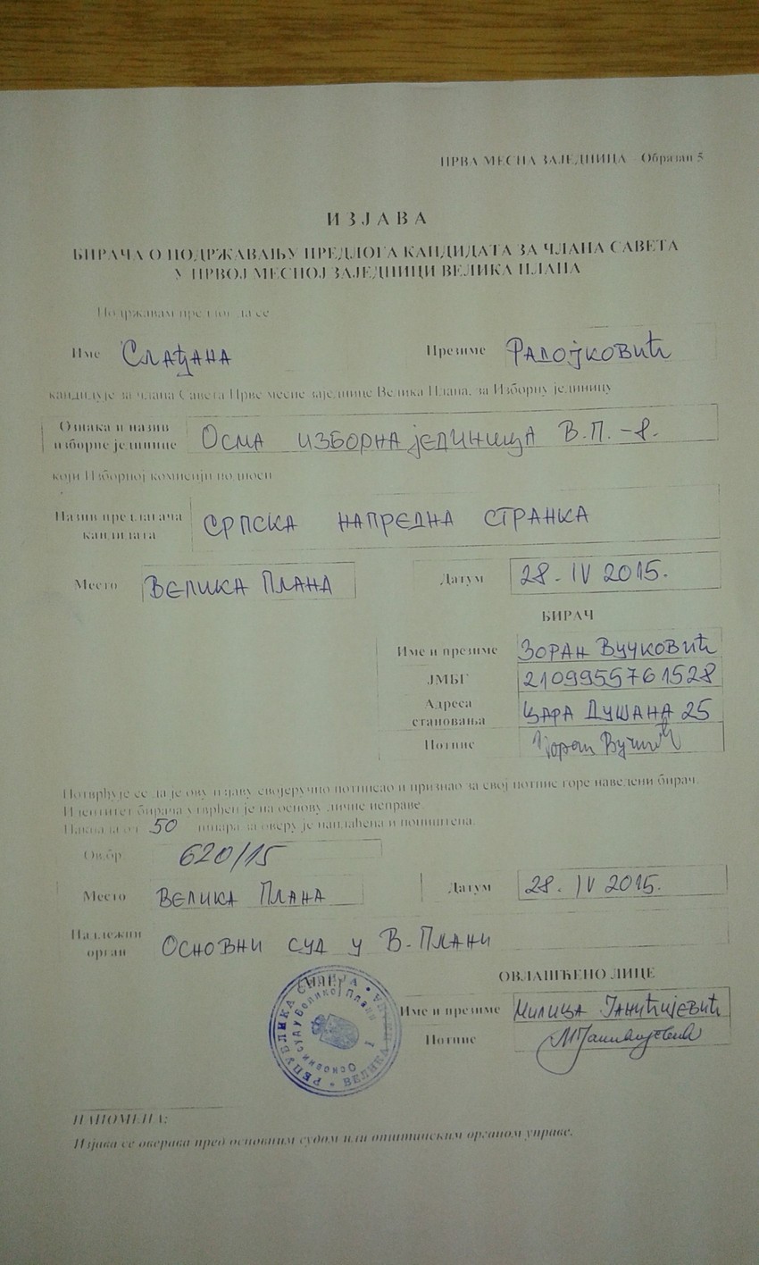 „Blic” je imao uvid u nekoliko izjava građana koji su negirali da su dali potpis za kandidata SNS. Zbog falsifikovanja potpisnika, već je nekoliko kandidata SNS diskvalifikovano.