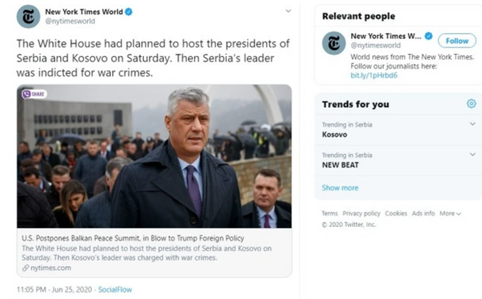 Najavljujući na Tviteru tekst o otkazivanju sastanka, "Njujork tajms je napisao da je do otkazivanja došlo jer je "lider Srbije optužen za ratne zločine", iako u podnaslovu ispod prateće slike u istovetnoj rečenici piše da se radi o "lideru Kosova".
