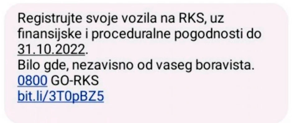 „Registrujte svoje vozila na RKS, uz finansijske i proceduralne pogodnosti do 31.10.2022. Bilo gde nezavisno od vašeg boravišta“, stoji u poruci koja je potpisana od strane kosovskog Ministarstva unutrašnjih poslova.