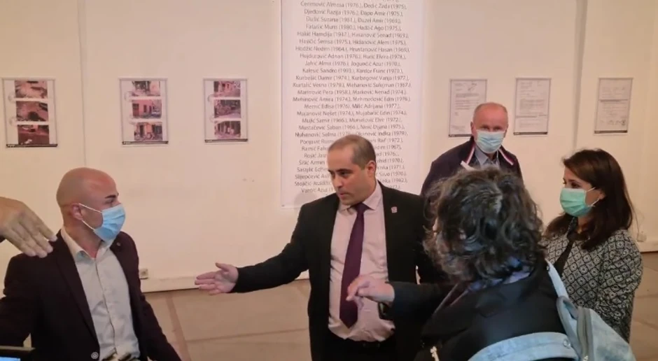 Predsednik Srpske desnice Miša Vacić napravio je novi skandal kada je večeras upao na izložbu "Kapija - I kad boli, istina je lijek" u Centru za kulturnu dekontaminaciju i oteo mikrofon organizatorima u želji da se obrati medijima.