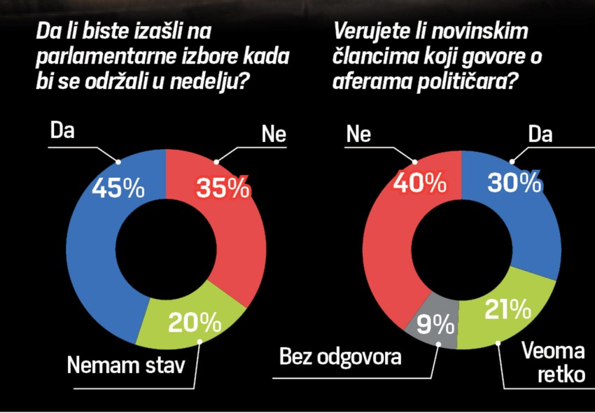 Kada je reč o izlaznosti, 45 procenata građana sigurno bi izašlo na glasanje, 35 ne bi, dok 20 ne zna ili nema stav.