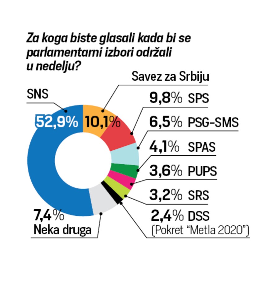 Ovo pokazuje poslednje istraživanje agencije Faktor plus. Srpska napredna stranka bi prema toj anketi osvojila 52,9 odsto glasova, Savez za Srbiju 10,1 odsto, a eventualna koalicija Pokreta slobodnih građana i Stranke moderne Srbije 6,5 procenata. Osim pomenutih, najbliža cenzusu je SPAS Aleksandra Šapića čiji je rejting oko 4,1 odsto. Partija ujedinjenih penzionera nalazi se na 3,6 odsto i malo je verovatno da će na izbore izaći samostalno, dok Srpska radikalna stranka uživa podršku od 3,2 odsto. Pokret "Metla 2020" ima 2,4 odsto podrške, a sve ostale uključujući nacionalne manjine zaokružilo bi 7,4 procenata.