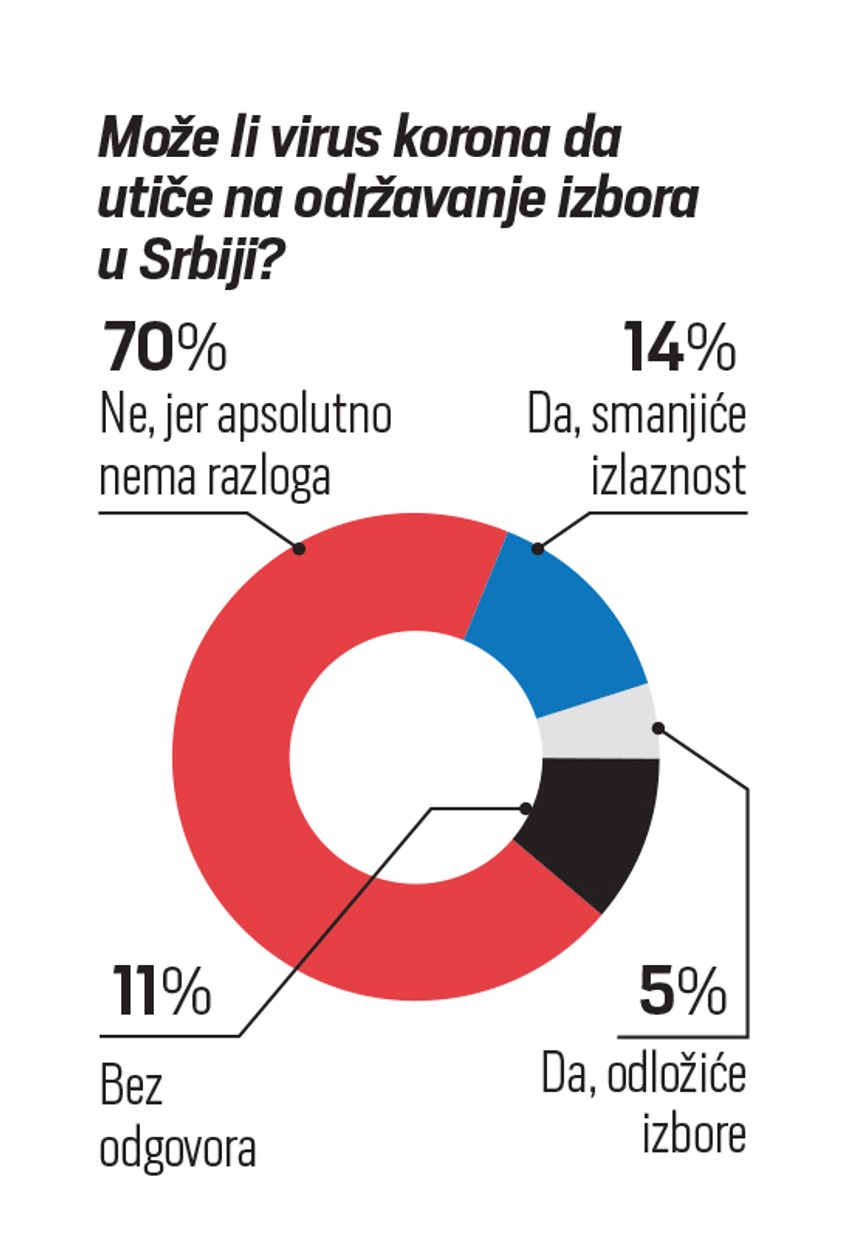 Lista oko Srpske napredne stranke bi da se izbori održavaju u nedelju, osvojila 59,8 odsto glasova, SPS i Jedinstvena Srbija 15,1 odsto, a SPAS Aleksandra Šapića 4,8 odsto.
