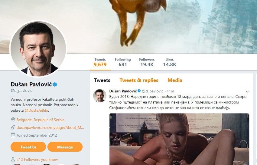 Pokret DJB juče je saopštio da im je hakovan Tviter nalog, sa koga su slate poruke uperene protiv DS i lokalnih izbora u Pećincima. Demokrata Goran Paunović je potom u šali upitao da li je to Dušan Pavlović iz DJB opet "čeprkao po kompjuteru", aludirajući na njegov skandal sa porno filmom, a onda se tim povodom oglasio i sam Pavlović.